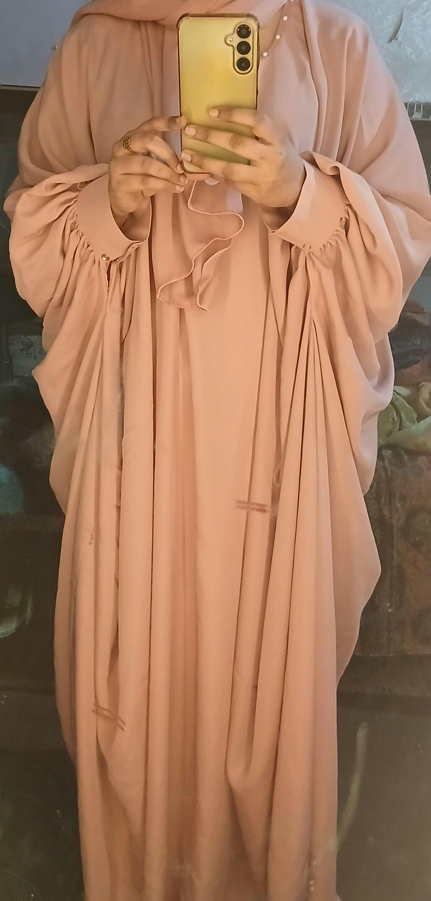 Cuff sleeves abaya is made from Nidha fabric and toned in a wonderful shade of pink. This Kaftan-styled abaya is embellished with lovely pearls at the neckline and on the scarf. This abaya will make you shine out and flaunt over different events and occasions.
